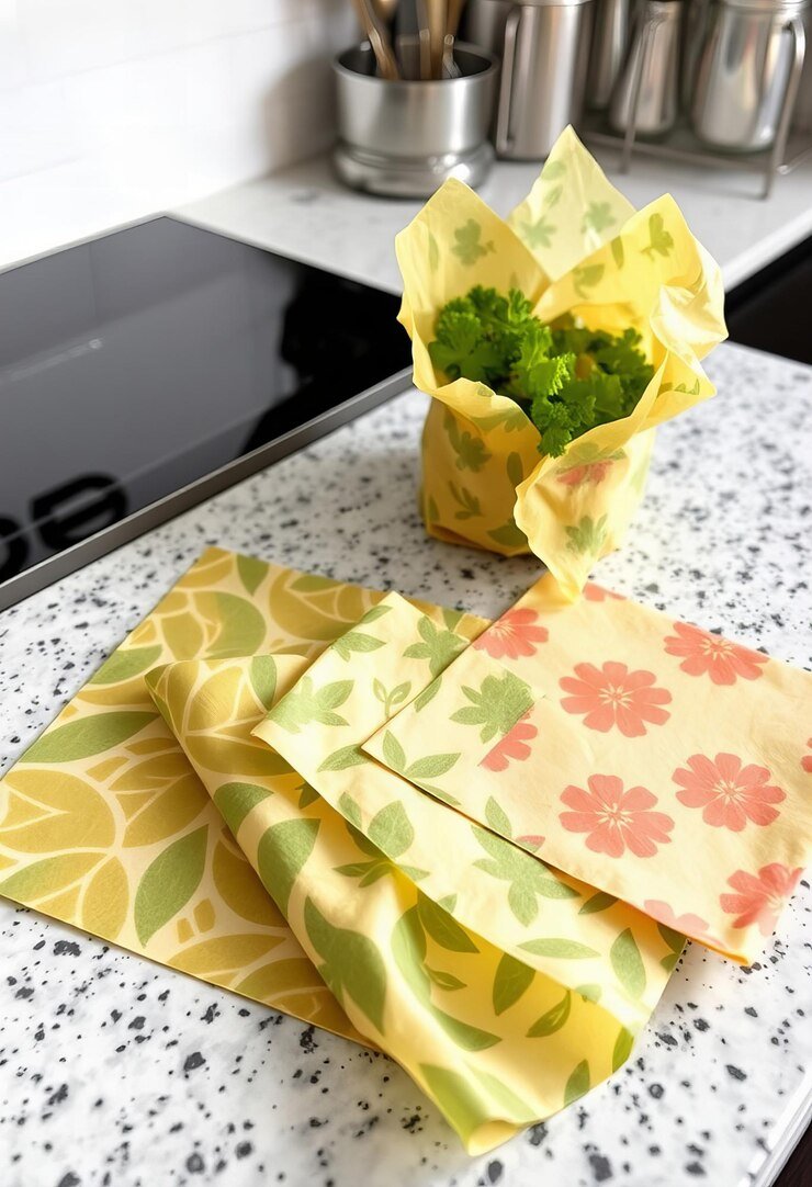 100% pamuk kumaş üzerine tamamen doğal balmumu, reçine ve jojoba yağı karışımı ile kaplanan bu kumaşlar, nefes alabilir yapısı sayesinde meyve, sebze, peynir, sandviç gibi yiyeceklerin ömrünü uzatır. Üstelik bulaşık deterjanı ile kolayca temizlenerek defalarca kullanılabilir.